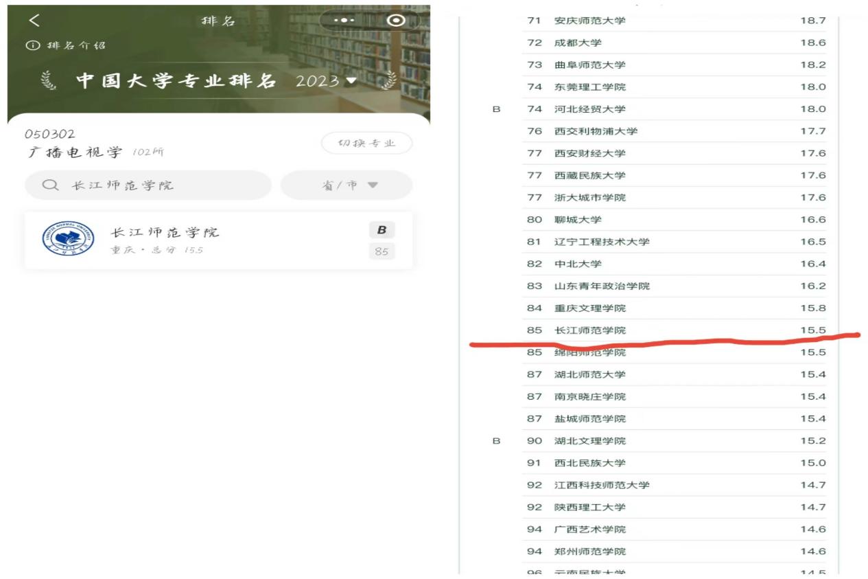 较之去年播音与主持艺术的19/284名,今年上升了10名,名列第79位;广播电视学的99/212名,今年上升了14名,名列第85位;网络与新媒体的81/270名,今年虽下降6名,名列第95位,但从B类专业,上升至B+类专业。