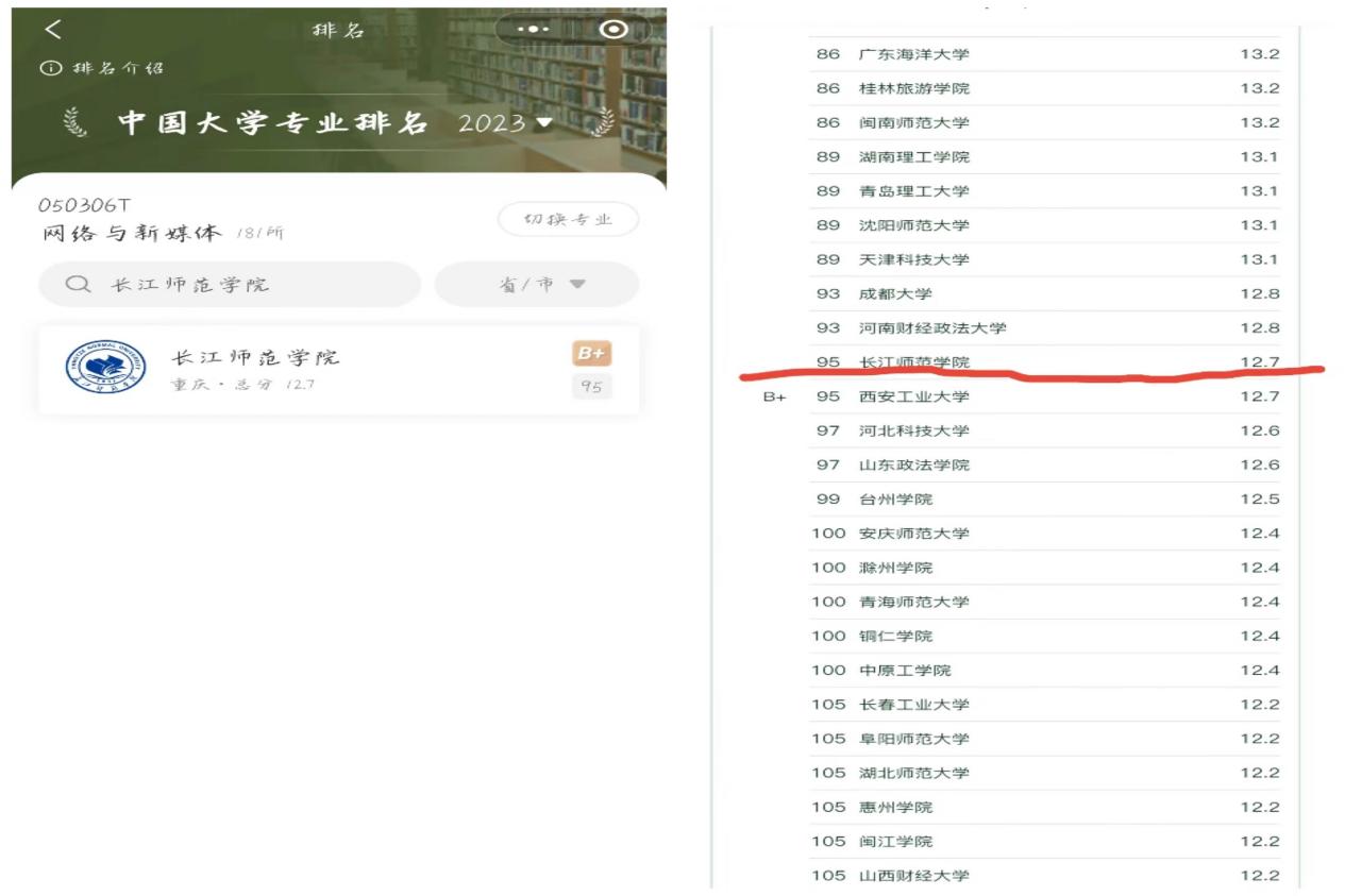 按照2023年“软科中国大学专业排名”,在全国270余所开办有网络与新媒体专业高校中,有181所高校上榜,海角论坛 网络与新媒体专业位于95位,如截图。