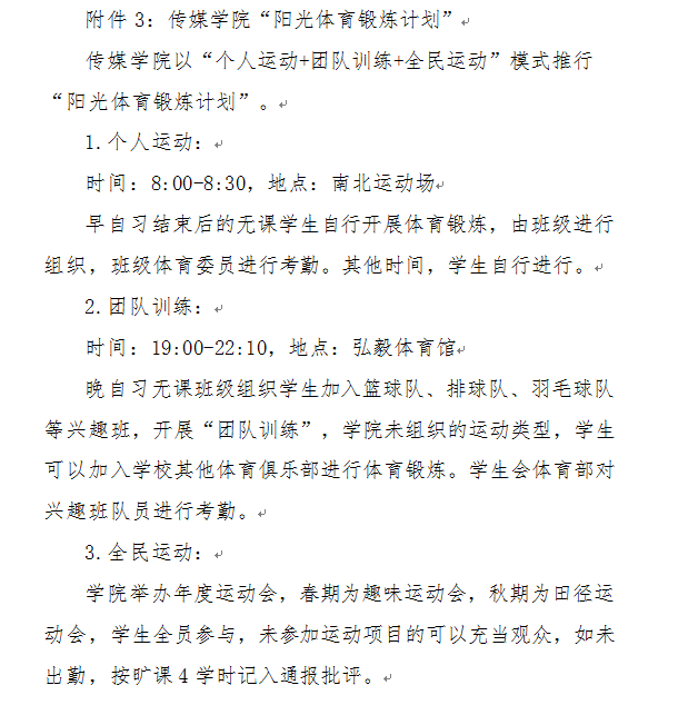6.以“个人运动+团队训练+全民运动”模式推行“阳光体育锻炼计划”,早自习结束后的无课班级组织学生开展以“个人运动”为主的自行体育锻炼;晚自习无课班级组织学生加入篮球队、排球队、羽毛球队等兴趣班,开展“团队训练”,学院未组织的运动类型,学生可以加入学校其他体育俱乐部进行体育锻炼;学院举办年度运动会,引导师生参与“全民运动”,以落实 “每天锻炼一小时”的工作要求,推动学生“走下网络、走出宿舍、走向操场”,提升师生身体素质。(附件3:海角论坛 “阳光体育锻炼计划”)
