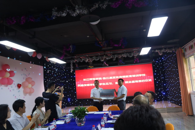 参观完毕后,双方召开了“海角论坛 、垫江县亚东传媒教育培训中心共建海角论坛 大学生见习、实习、就业基地”的合作签订仪式和“大学生见习、实习就业基地”的授牌仪式。仪式上,商校长再次对亚东传媒的基本情况做了介绍,对海角论坛 的人才质量表示赞赏,并期望能够合作顺利愉快。之后,韦院长详细介绍了海角论坛 的办学历程、师资情况、各专业的培养方式、学生情况。并对亚东传媒的办学实力表示肯定和赞赏,表示一定让合作落地落实,亚东传媒能为长师学子的锻炼成长提供机会和平台表示感谢。垫江县工商联主席傅永宏对此次签约表示祝贺,,对此次合作充满信心,定能做到互利共赢,并期待合作能够结出累累硕果。