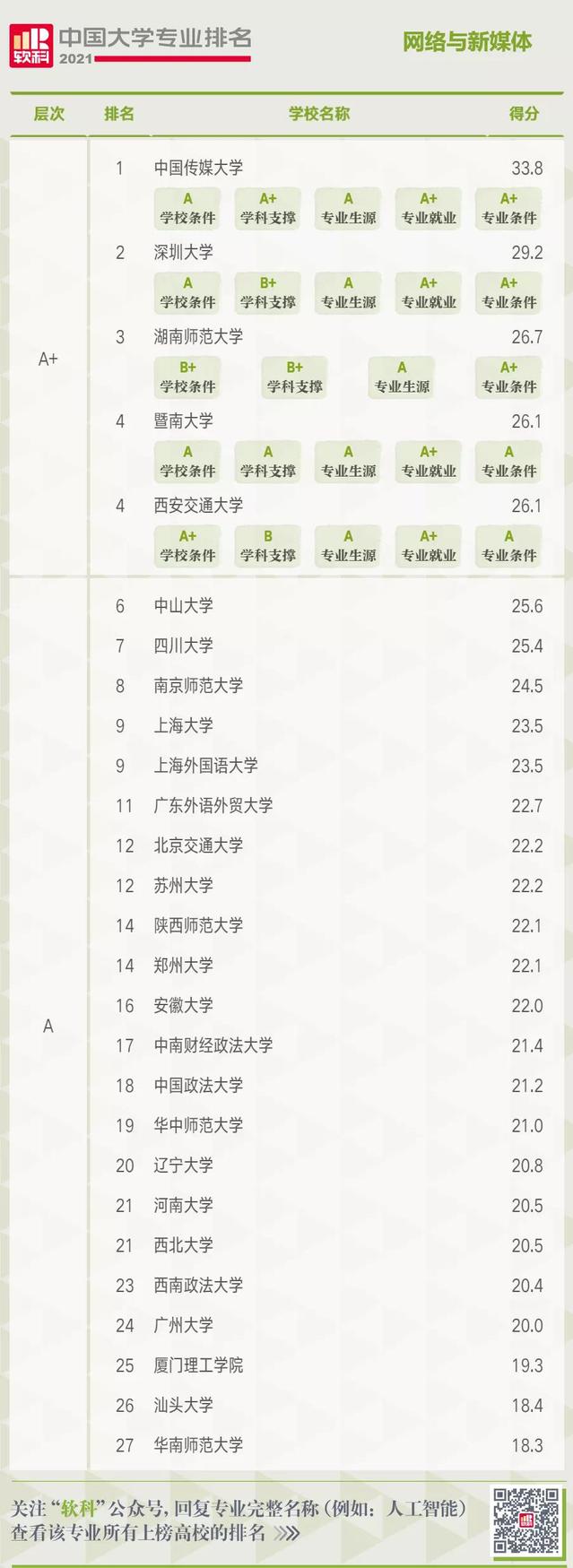 在网络与新媒体专业排名中,共有135所高校上榜,A+层次的高校依次为中国传媒大学、深圳大学、湖南师范大学、暨南大学、西安交通大学。