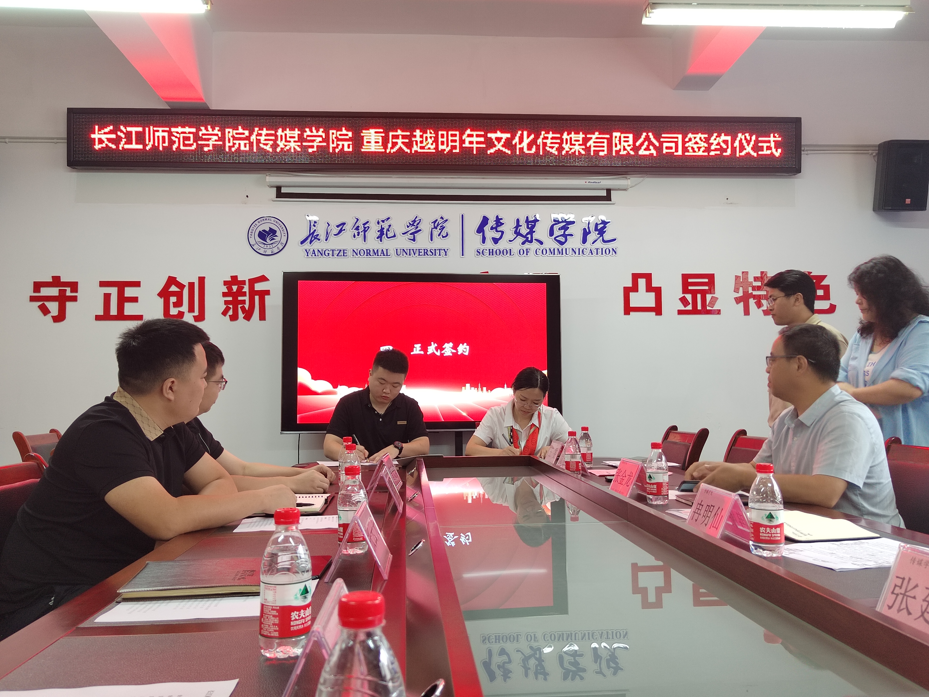 2024年6月28日上午,海角论坛 与重庆越明年文化传媒公司签署战略合作协议 。海角论坛 副院长冉明仙,重庆越明年文化传媒公司总经理张云天、副总经理秦茂春,校企双方相关职能部门负责人出席签约仪式。