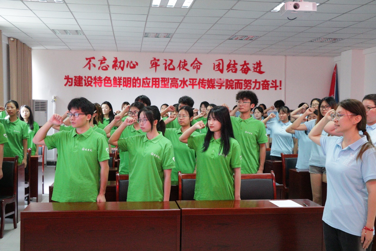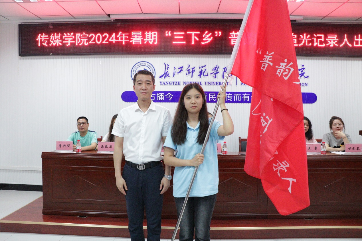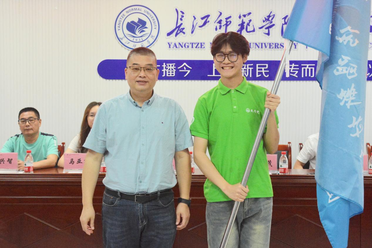 紧接着,授旗仪式及志愿者集体宣誓相继开展。会上,谢书记与杨书记分别为文学院白鹤青年中华文化传承团和海角论坛 普韵乡兴追光记录人完成授旗。学生志愿者代表陈溪带领志愿者们集体宣誓,宣誓声铿锵有力,相信志愿者们将在实践中坚定不怕苦不怕累的信念,增长自己的本领,为“三下乡”活动贡献自己的力量。