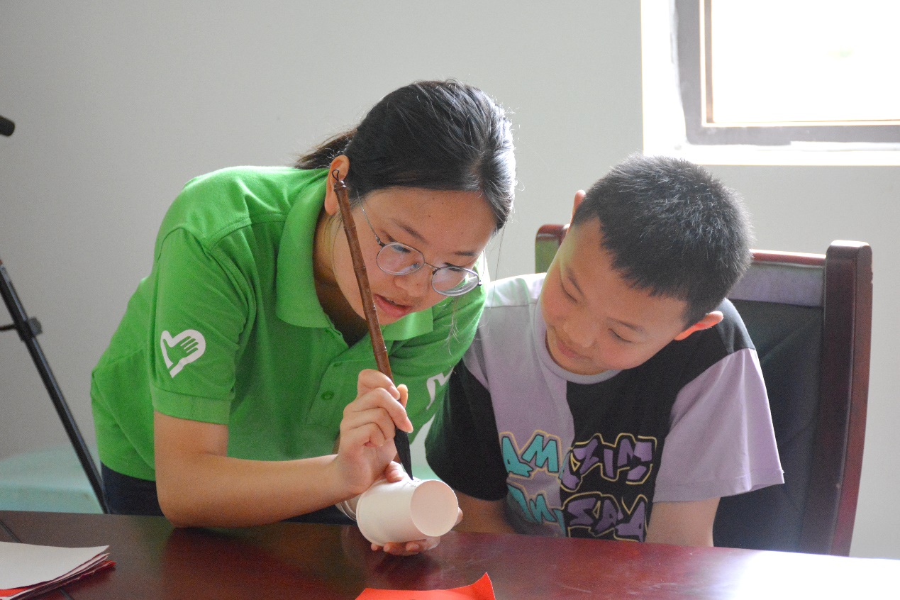 随后,志愿者曹文静进行书法教学。她强调了书写时的正确坐姿和掌握正确握笔姿势的重要性,并给学生们演示了正确的坐姿和握笔姿势。紧接着,曹文静为小朋友们讲解楷书的特点以及基础偏旁的教学并进行书法演示,同学们认真听讲,对楷书有了初步的认识和了解。在志愿者的指导下,小朋友们一笔一画地进行练习,感受着汉字的魅力。此外,志愿者还融合诗词教学鼓励小朋友们进行诗歌创造及纸杯创意绘画,丰富了小朋友们的学习形式。