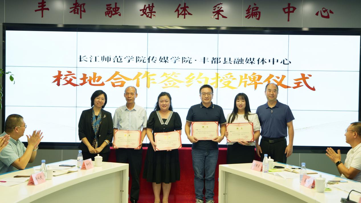 为进一步夯实合作基础,在与会人员的共同见证下,双方代表正式签署了校地合作协议。向丰都县融媒体中心进行了“实习就业基地”授牌。