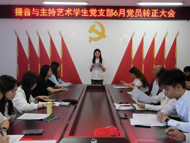 6月27日海角论坛 播音与主持艺术学生党支部于格致楼2318会议室开展6月党员转正大会。会议由支部书记甘元琴主持,全体党员参加此次大会。