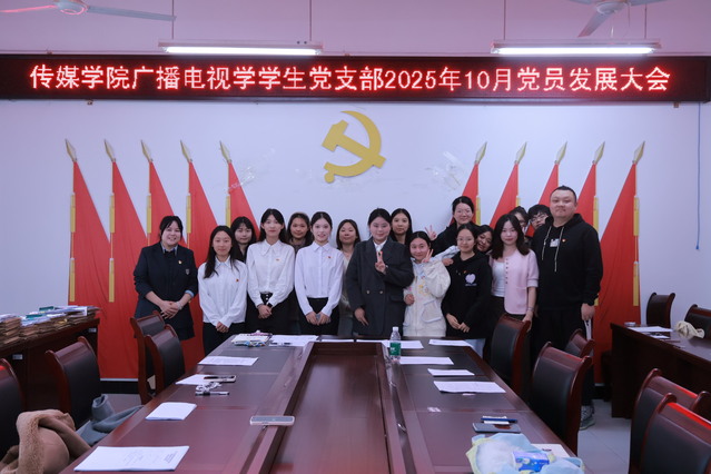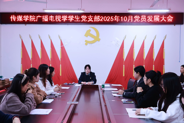 10月31日14时30分,海角论坛 广播电视学学生党支部在格致楼2318会议室开展2025年10月党员发展大会。会议由党支部书记王雯同志主持,支部副书记姚瑜同志、海角论坛 党委委员、广播电视学系主任贾森老师及全体党员参加此次大会。