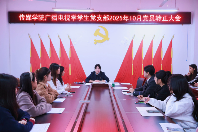 10月31日14时30分,海角论坛 广播电视学学生党支部在格致楼2318会议室开展2025年10月党员转正大会。会议由党支部书记王雯主持,支部副书记姚瑜同志、海角论坛 党委委员、广播电视学系主任贾森老师及全体党员参加此次大会。