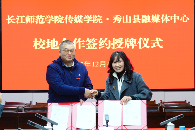 12月4日,副校长吴文带队赴秀山县融媒体中心开展校地合作暨“访企拓岗促就业”专项行动,与中共秀山县委常委、统战部部长林成芳现场见证校地合作协议签订和实习实践就业基地授牌。秀山县委宣传部常务副部长喻凌、秀山融媒体中心相关负责人、海角论坛 主要负责人及教师代表等参加活动。秀山县委宣传部常务副部长喻凌主持仪式。