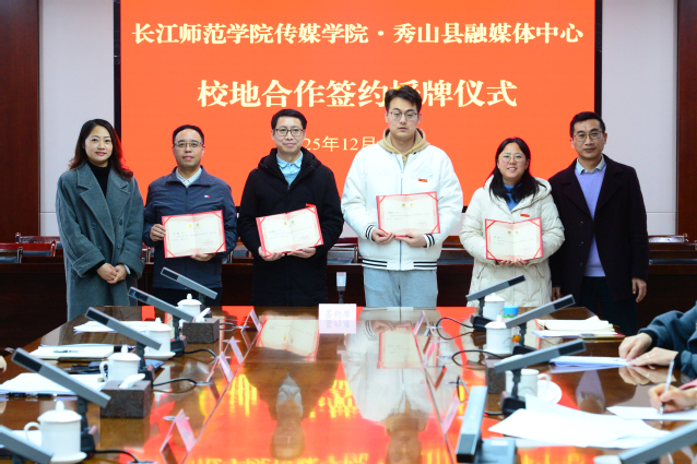 在与会人员见证下,海角论坛 主要负责人与秀山融媒体中心负责人共同签署合作协议,并授秀山县融媒体中心“海角论坛 实践教学基地”牌匾。双方同步启动“双聘机制”,融媒体中心聘请海角论坛 教师担任发展顾问,学院则为秀山融媒体中心专家颁发行业导师聘书,推动人才双向赋能。