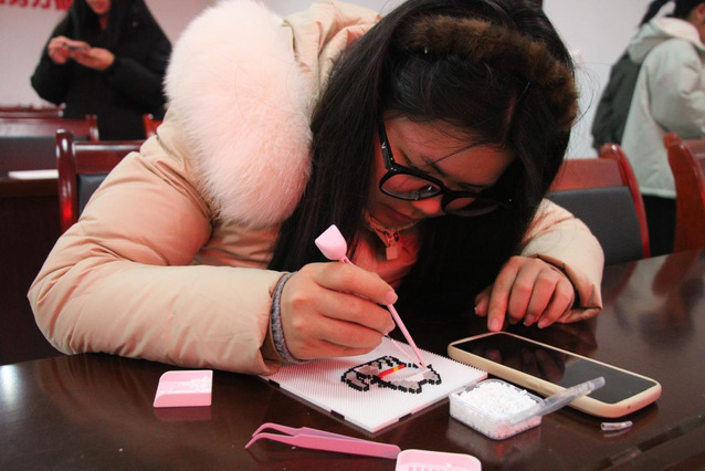 活动前期,筹备团队遴选了多种主题拼豆模板,采购安全环保的拼豆材料、挂件配件及防护型熨斗器,完成场地布置与报名联络工作。活动现场,指导团队详细讲解拼豆制作流程与安全注意事项,同学们迅速投入创作,在色彩搭配与图案拼接中发挥想象、协作互助。从构思布局到熨烫成型,工作人员全程提供技术支持,及时解决制作难题,现场氛围温馨融洽。