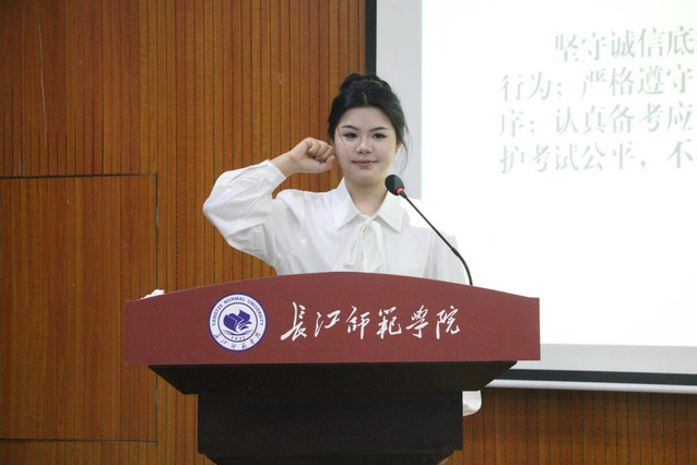 随后,冉明仙院长围绕2025年秋期期末诚信考试发表讲话。她强调,期末备考需做好双重准备,既要扎实巩固专业知识,也要提前备齐身份证、准考证、2B铅笔等考试用具,避免因细节疏漏影响考试状态;她告诫全体同学,切勿心存侥幸触碰作弊红线,一旦违反考纪,不仅会面临严肃处分,更会对评优评先、奖助学金申请等产生不可逆的负面影响;她还提到,要重视学习与考试的规律性意识,以日常课堂认真听讲、课后及时复习的踏实态度备考,而非依赖考前突击、投机取巧,真正做到以实力应考,以诚信立身。