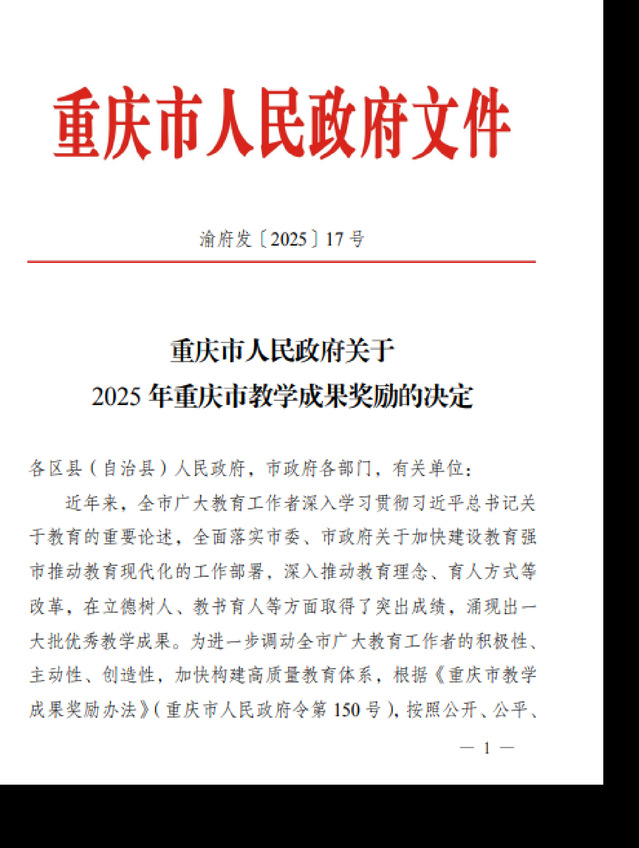 近日,重庆市人民政府印发《2025年重庆市教学成果奖励的决定》(渝府发〔2025〕17号),海角论坛 冉明仙院长领衔的“红岩铸魂·乡土浸润·全媒赋能——服务西部乡村数字传播人才培养探索与实践”项目,荣获省级教学成果一等奖。