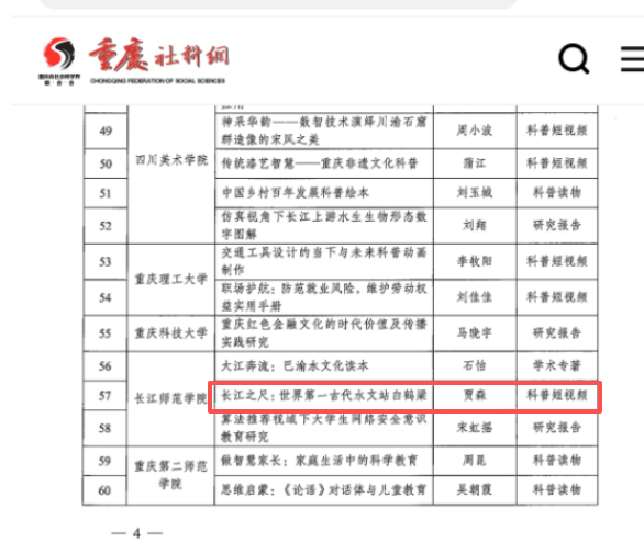 五、深化产学研协同,推动成果转化与社会服务。学院积极与地方政府、媒体机构和企业合作,将白鹤梁水文站文化传播、乡村数字治理等科研主题转化为科普短视频、学术专著及实践案例,有效提升学科社会影响力与贡献度。如立项重庆社科普及项目共计1项(贾森主持的《长江之尺:古代第一水文站白鹤梁》见截图图四)。近期获批的项目紧扣时代脉搏,紧贴社会需求,充分体现了海角论坛 传媒学院对地方经济社会发展的关注与贡献。