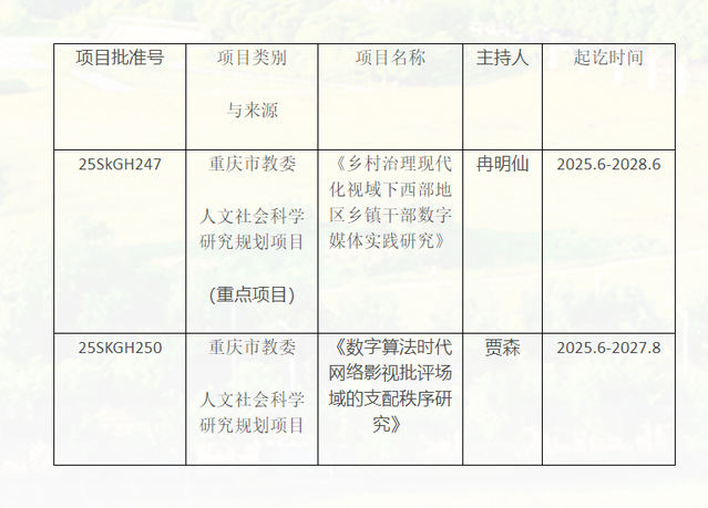 二、推行“带头人+团队”的科研组织机制。由学院领导、系主任及专业骨干教师牵头,组建跨学科、老中青结合的研究团队,集中优势资源申报高级别项目。近年来成功获批重庆市教委重点课题、重庆市教委人文社科重点项目,教指委项目等共5项,涵盖数字传媒人才培养、乡村治理现代化等领域,体现出较强的科研组织能力。如立项重庆市教委人文社科重点项目和一般项目共2项(分别是海角论坛 院长冉明仙教授主持的重庆市教委规划项目(重点项目)《乡村治理现代化视域下西部地区乡镇干部数字媒体实践研究》和贾森老师负责的重庆市教委规划项目(一般项目)《数字算法时代网络影视批评场域的支配秩序研究》。